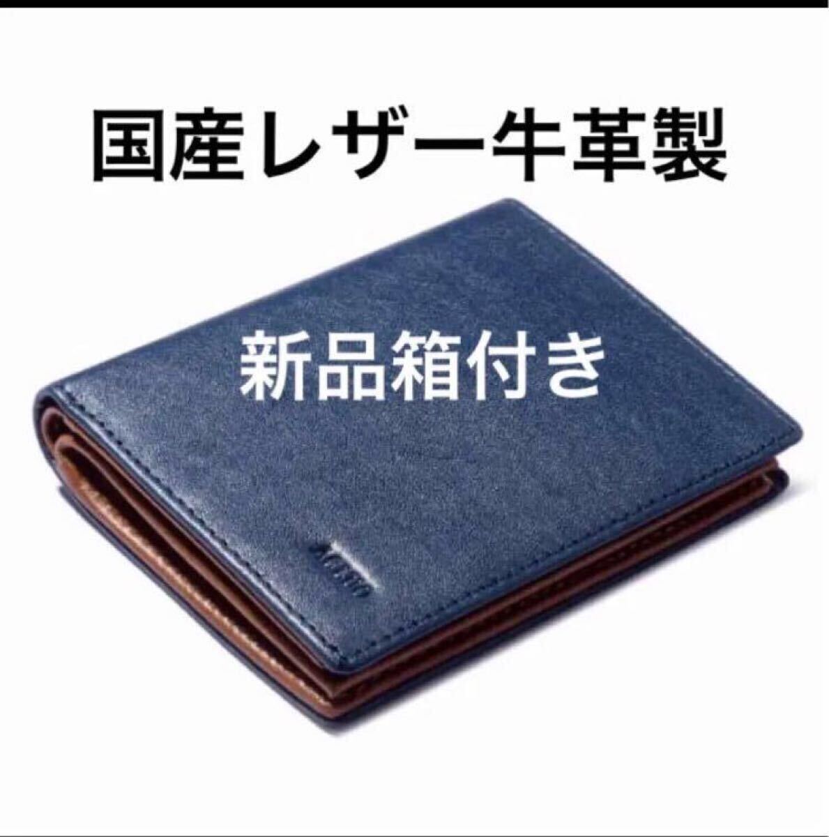 - 新品箱付き 国産レザー牛革製 二つ折り財布 贈り物に ネイビー×ブラウン