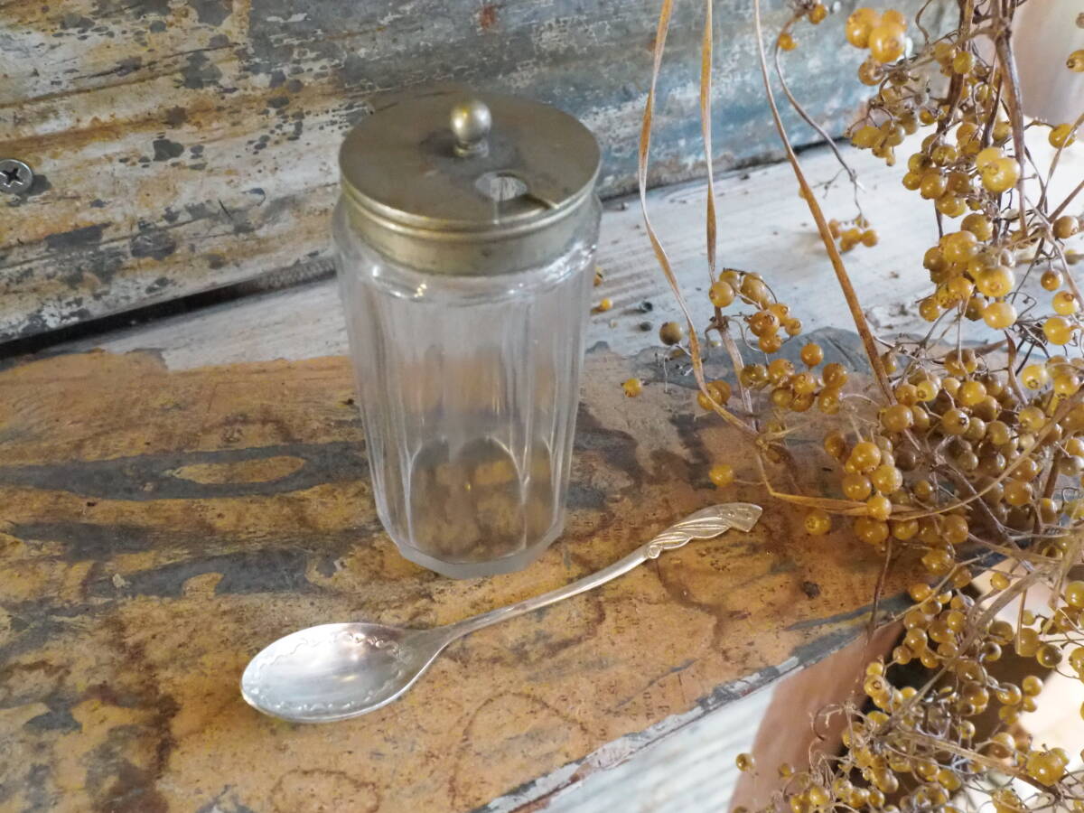 - 【フランス蚤の市シュガーポット】スプーン付き砂糖入れガラス瓶コーヒー容器カフェ古道具アンティーク骨董インテリアインダストリアル