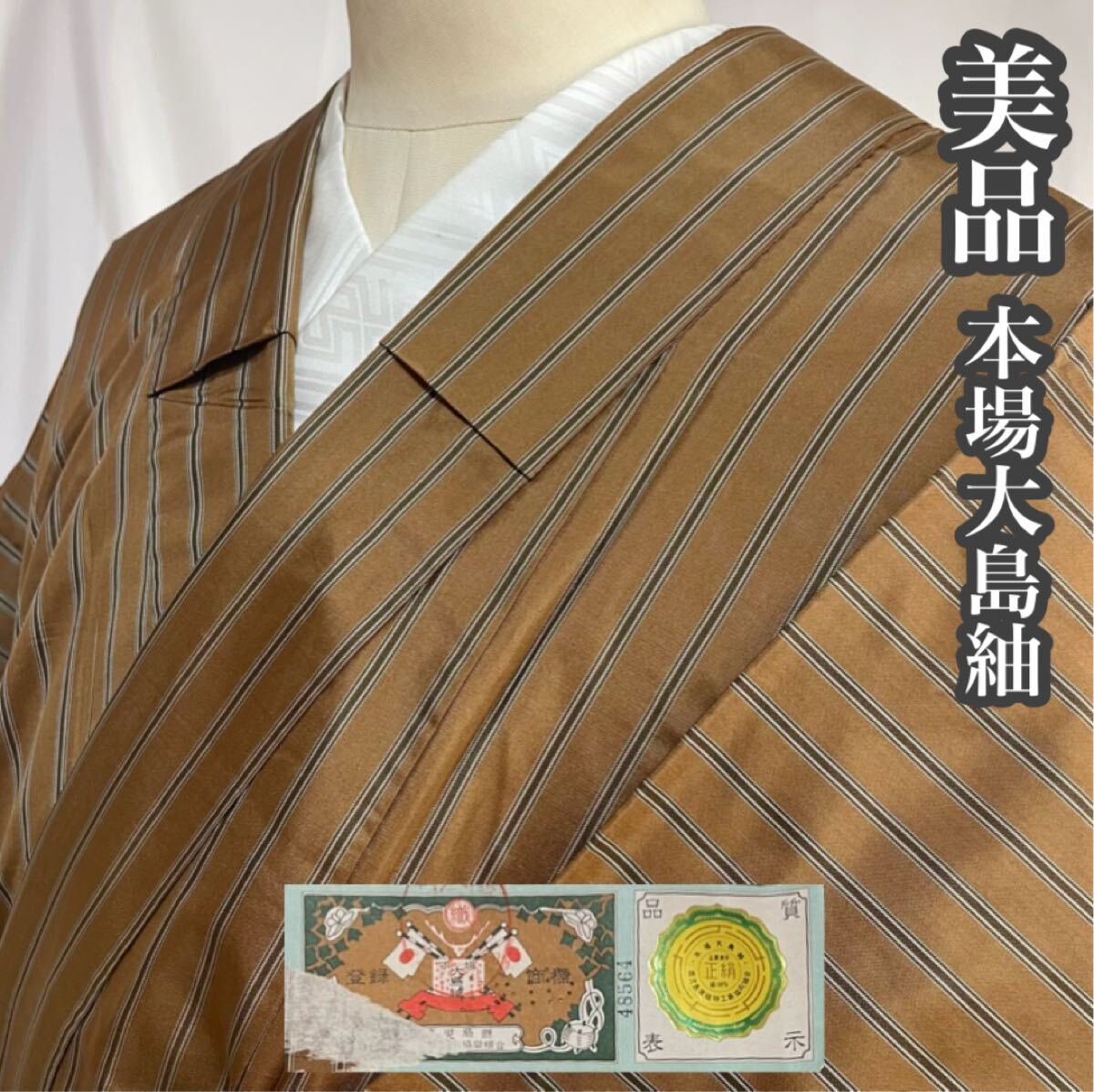 - #H721 美品 本場大島紬 証紙付き 縦縞模様 正絹 和装 和服 着物【wellriver】
