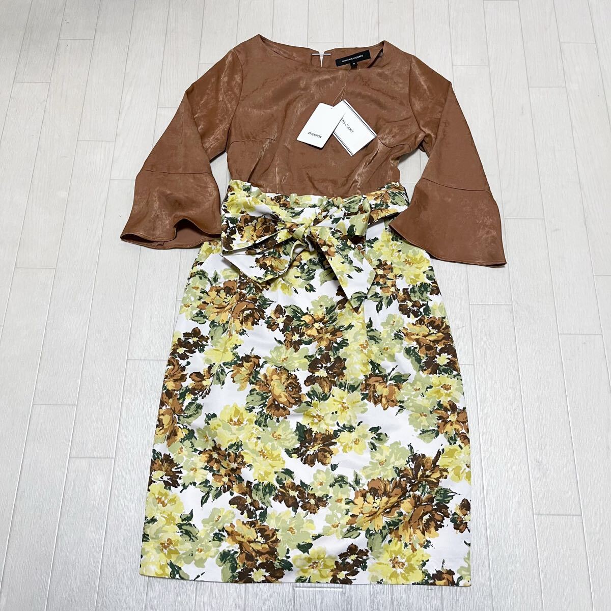 > 和808★① 新品 定価24000円 QUEENS COURT クイーンズコート 切替 タイトワンピース 花柄 マキシ 0 ブラウン ホワイト レディース