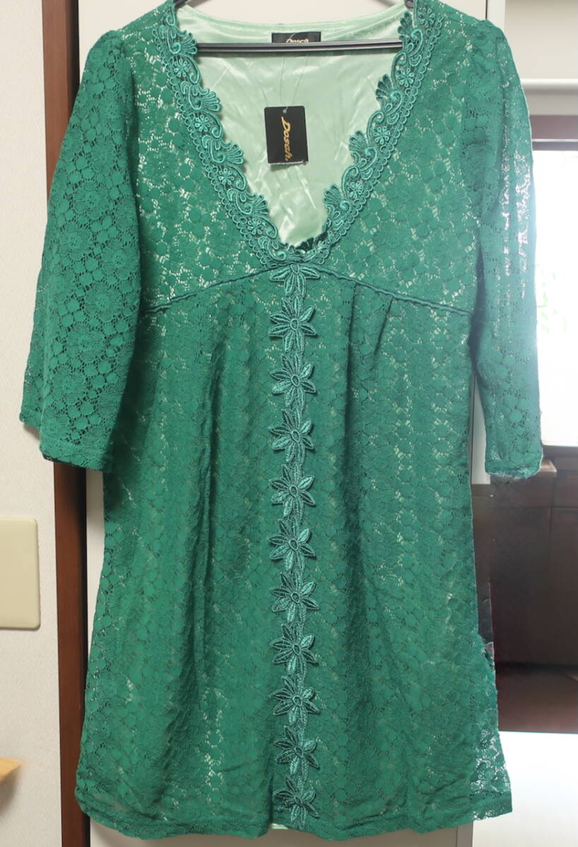 - Dosch/ドスチ★グリーン総レース7分袖ワンピース【L】ドレスにも・未使用