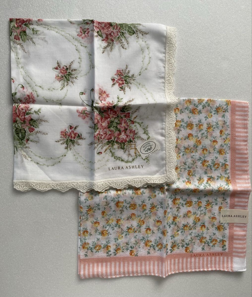> 新品未使用品◆LAURA ASHLEY ローラアシュレイ ガーゼハンカチ 2枚セット ブーケ&小花 レース
