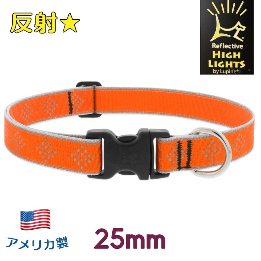 > ワンタッチ首輪・Mサイズ・25mm幅 反射オレンジダイヤモンド柄 40-71cm LUPINEルパイン アメリカ製 軽量丈夫 中型犬・大型犬