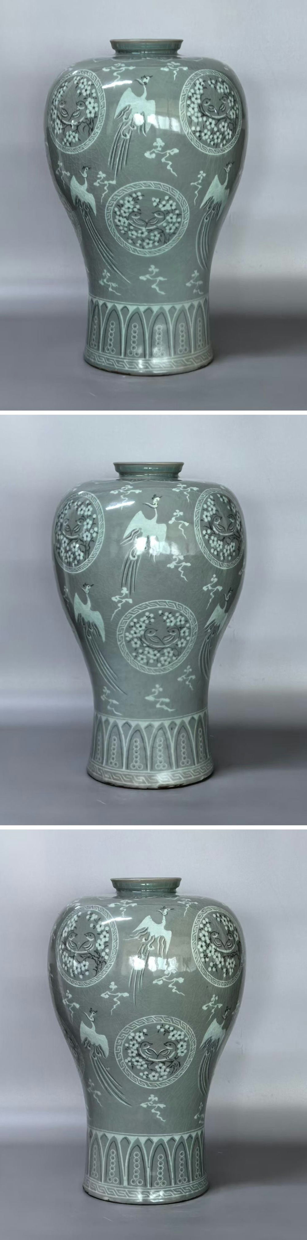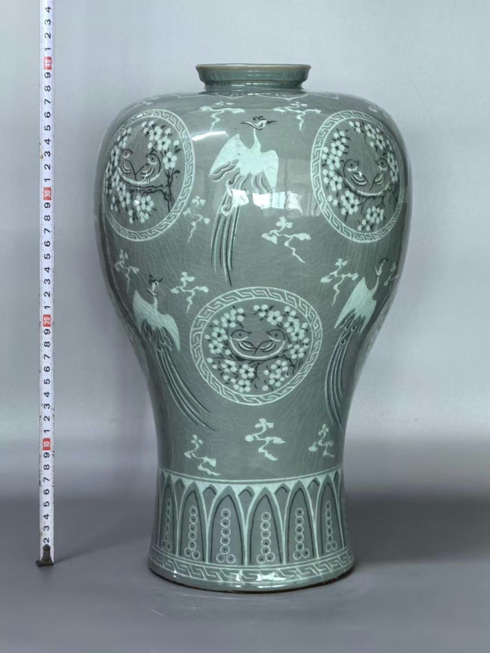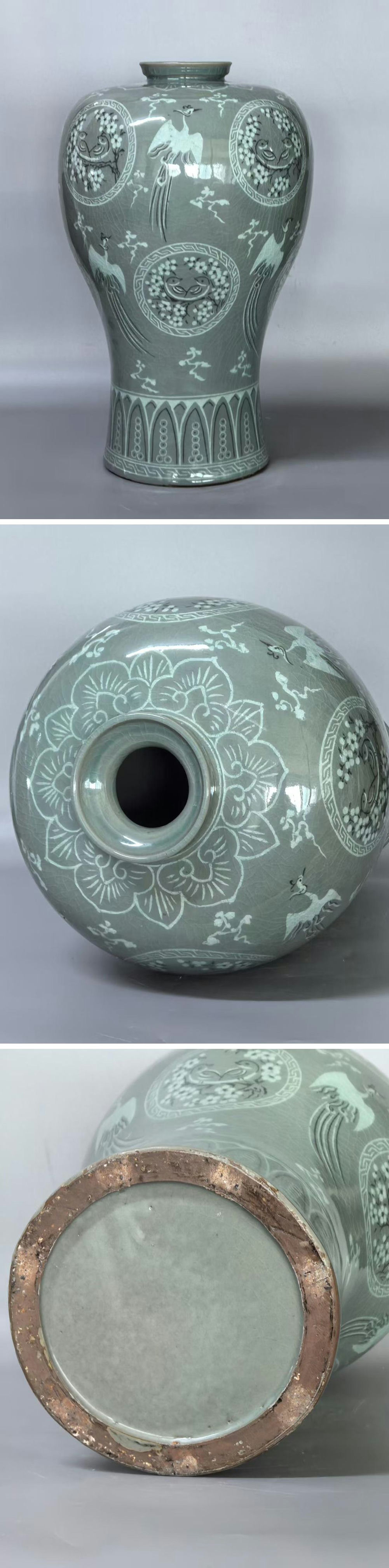 - ▼渡鶴羽▼P7754コレクター放出 朝鮮古美術 高麗磁 李朝時代 古高麗 高麗青磁黒白象嵌梅瓶