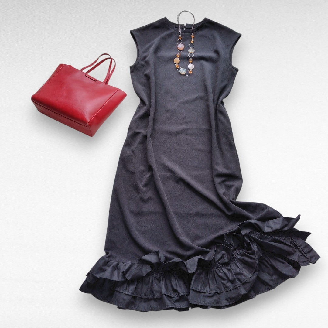 - 美品 DONOBAN ドノバン フリルヘムワンピース フレンチスリーブ ノースリーブ ロング 裾フリル 黒 フリー 250716-04