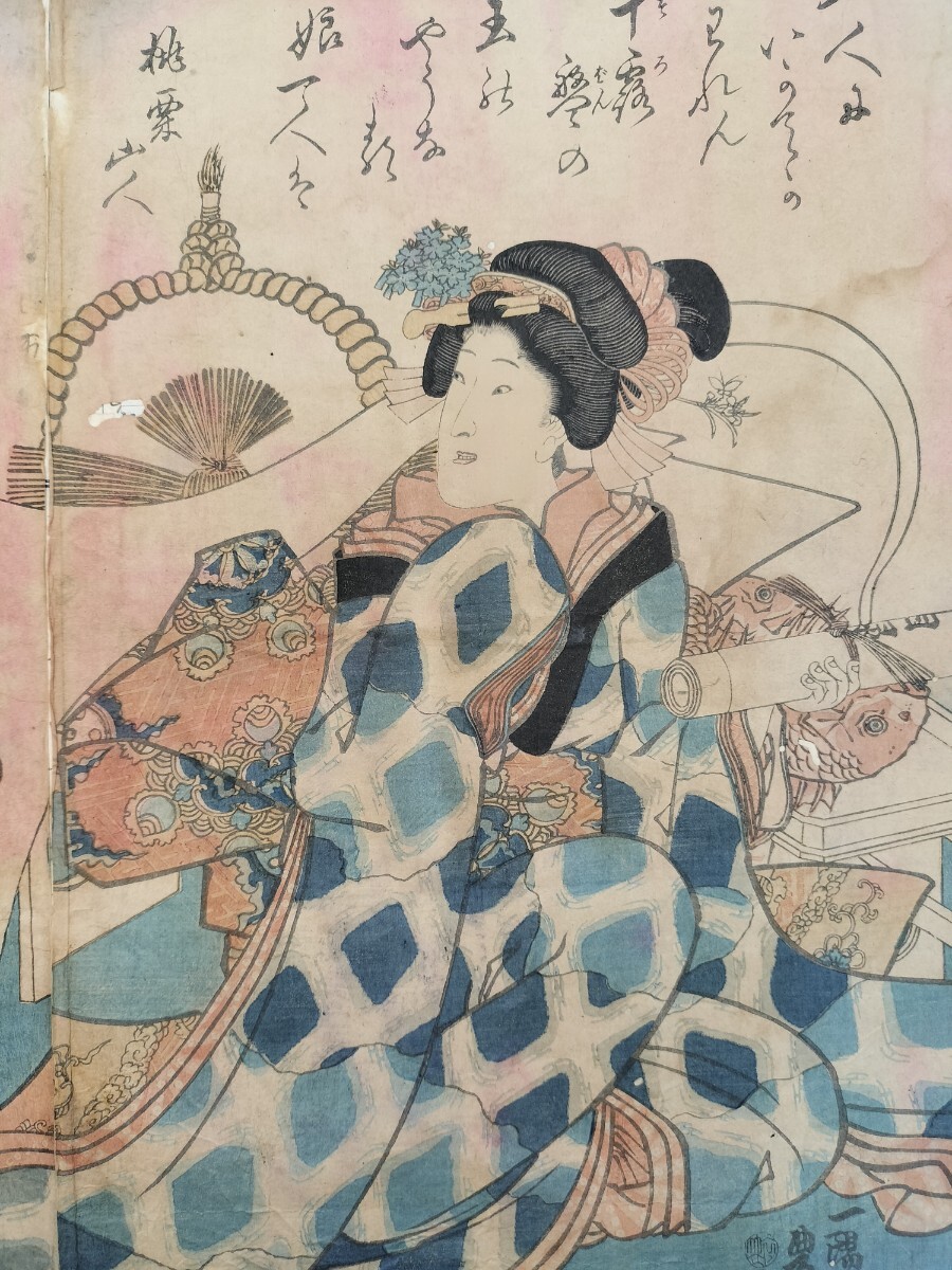 - 江戸期/真作 歌川豊国「獨娘に聟八人」本物浮世絵木版画 美人画 錦絵 大判 二枚続き 裏打ち