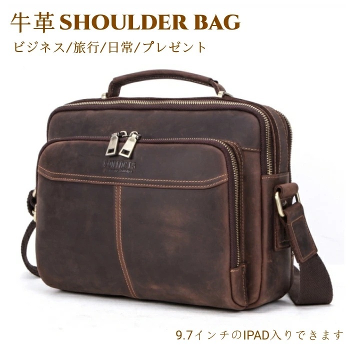 - メンズ 牛革 メッセンジャーバッグ 斜めがけ ショルダーバッグ 本革 レザー ビジネス バッグ ブリーフケースバッグ bg0630 コーヒー色