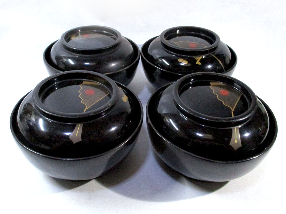 - ★昭和レトロ 木製 漆塗り 蓋付き お椀セット 4組 中古 塗ハガレ有★S13241