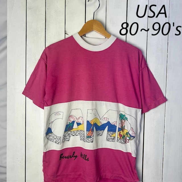 > T●256 USA古着 80s 切り替え カットソー Tシャツ L~ オールド ヴィンテージ アメリカ古着 ピンク シングルステッチ