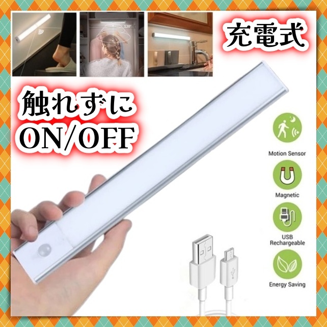 > 薄型 30cm LED 人感 センサー ライト 充電式 調光 手元 足元 自動 点灯 消灯 玄関 階段 廊下 クローゼット DIY 脱着簡単 消し忘れ防止