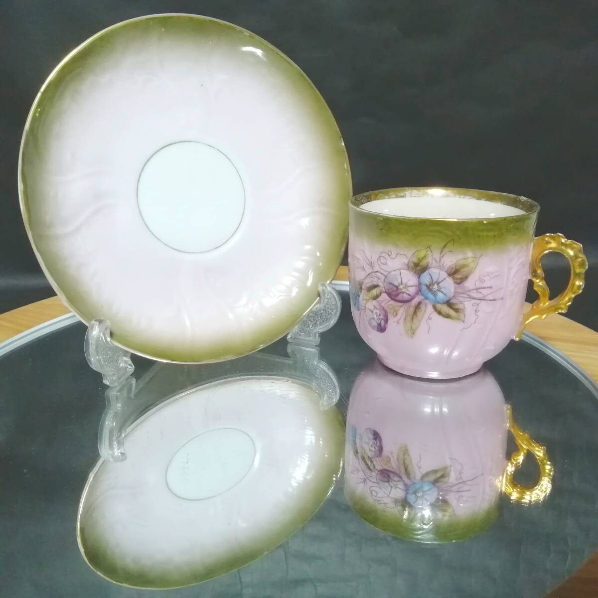 - アンティーク◆桃色花柄 カップ&ソーサー 取っ手特徴あり リモージュ?