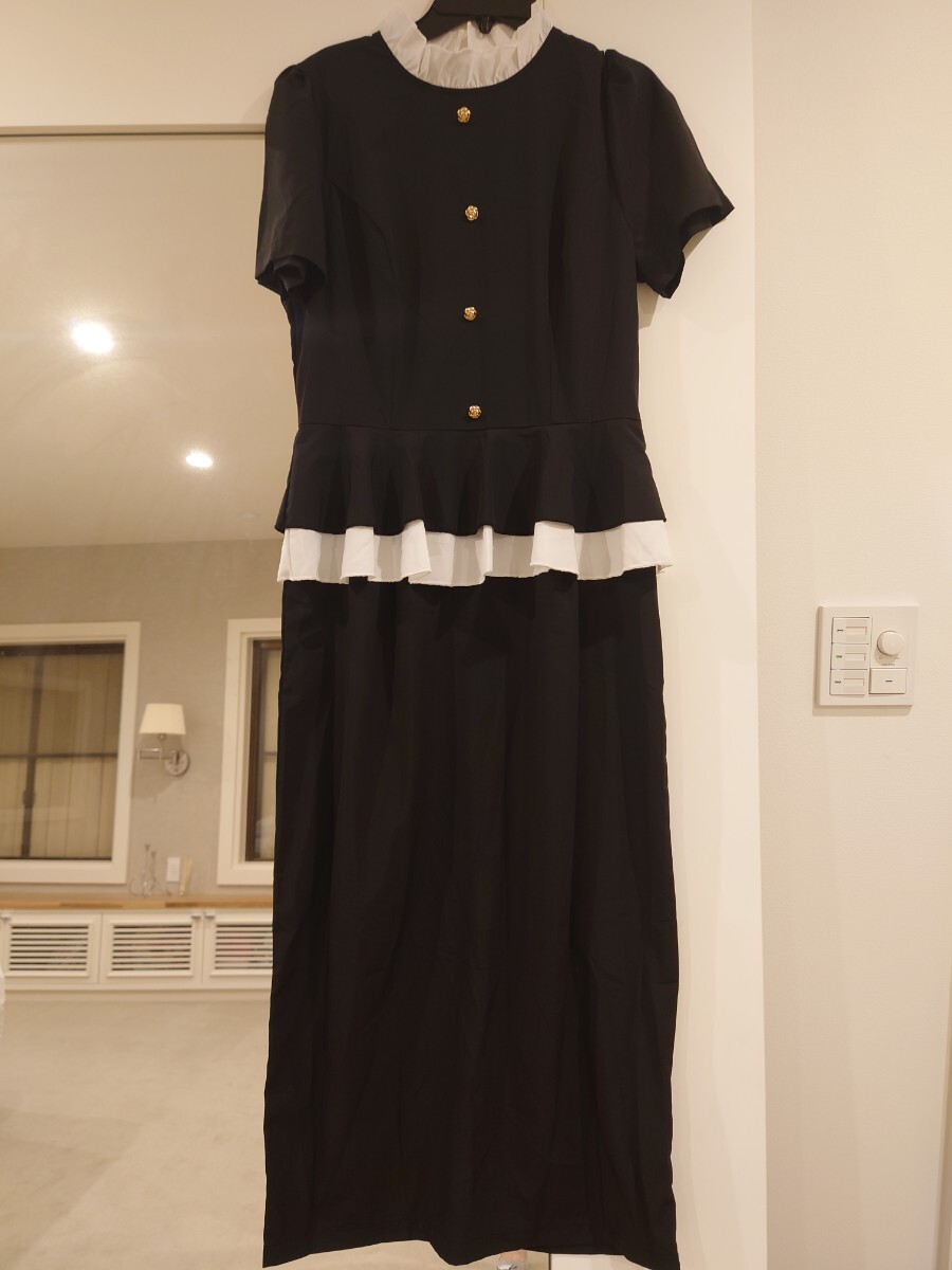 - SHEIN 黒半袖白フリルワンピース膝丈 Мサイズ