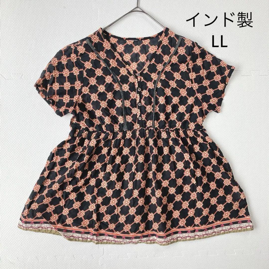 - インド製 総柄ブラウス LL エスニック バリ島 コットン ウッドボタン