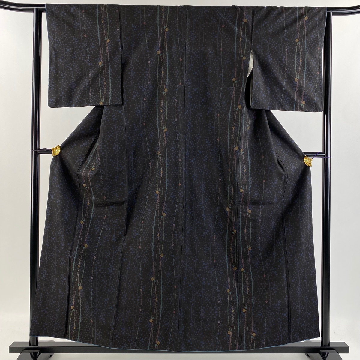 > 紬 身丈156.5cm 裄丈62.5cm S 袷 よろけ縞 幾何学 墨色 正絹 名品 【中古】