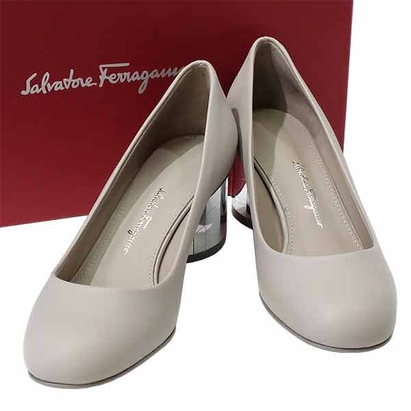 - 送料無料 本物 美品 SalvatoreFerragamo サルヴァトーレフェラガモ パンプス レザー グレージュ 約22.0cm ラウンドトゥ チャンキーヒール