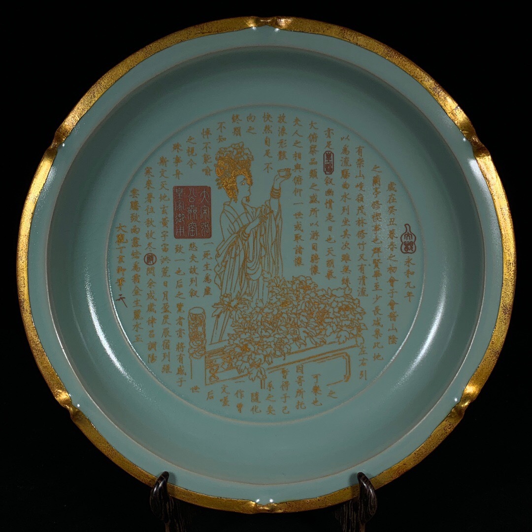 - 蔵友旧蔵出 宋 汝窯 銘文 金嵌 仕女紋 花口盤 稀少珍品 貴重品 古陶瓷品 置物 古賞物 中国古玩 中国古美術品