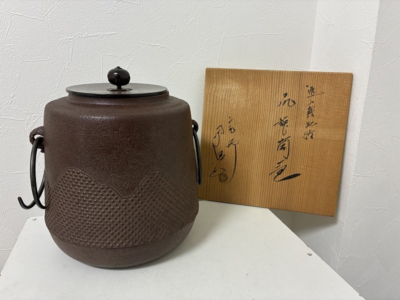 遠州霰地紋 筒釜 釜師 人間国宝 佐藤浄清造 釜環 共箱ありです。