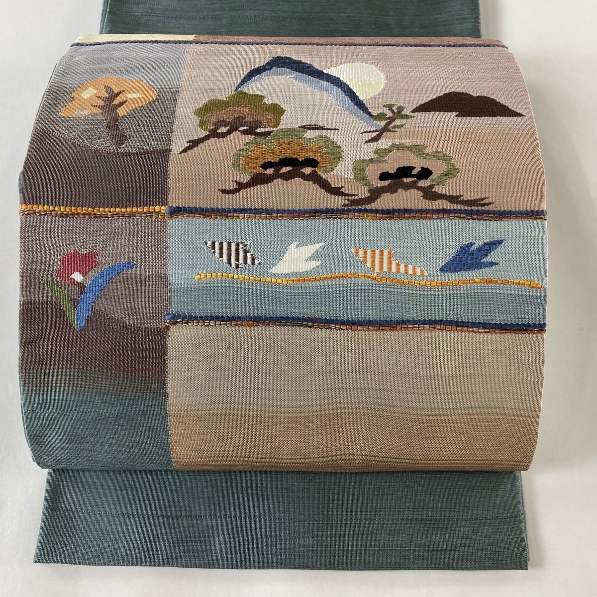 > 袋帯 美品 秀品 笠松 草花 灰緑 お太鼓柄 正絹 【中古】