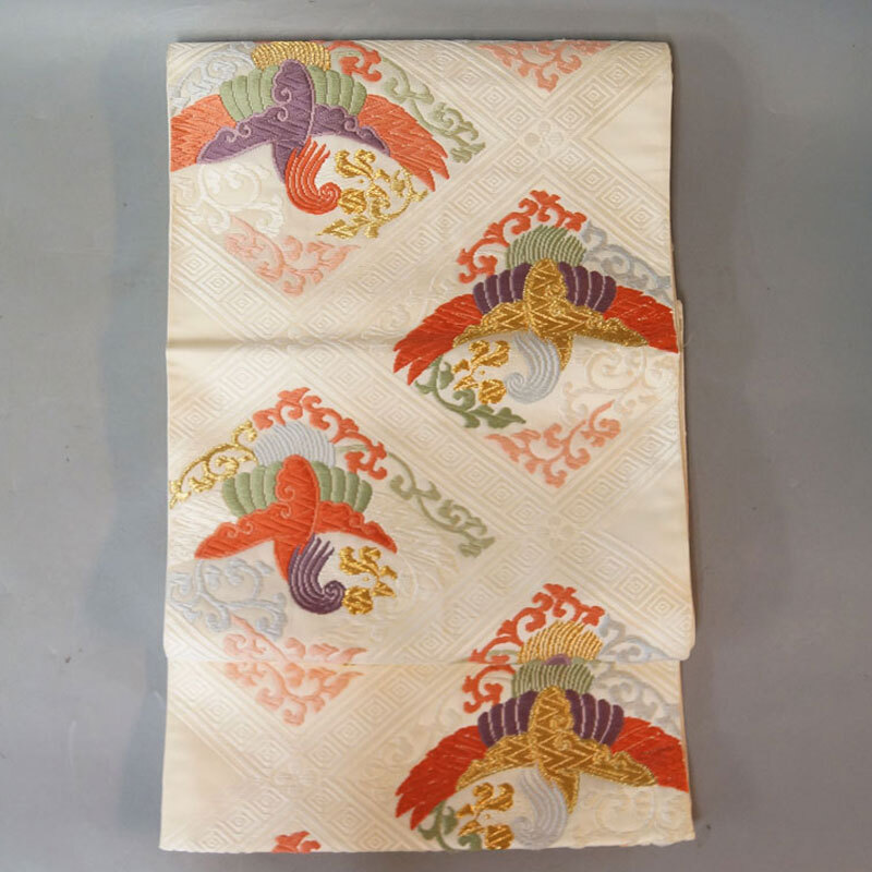 > ye55 本袋帯 六通柄 正絹 生成り色 金糸 銀糸 柄 高島屋 着物 最高級 仕上がり品 着物帯 和服 和装 振袖