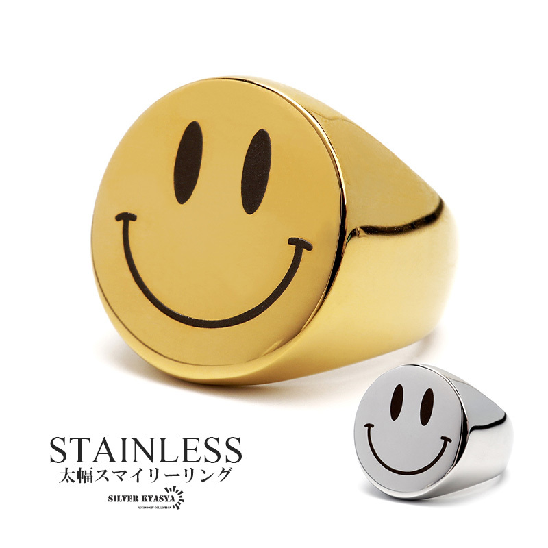 - (ゴールド、14号) ステンレス スマイリー リング 印台リング ゴールド シルバー 2カラー シンプル 丸形 指輪 ごつめ 太め