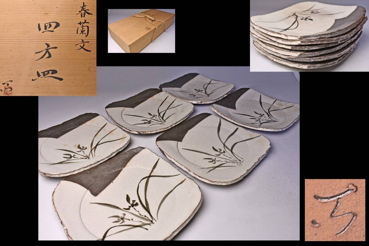 > 加山哲也 ★ 春蘭文四方皿 6客 ★ 共箱 ★ 粉引 ★ 日本画家 加山又造 の子 ★ 番浦史郎 師事 ★ 板皿