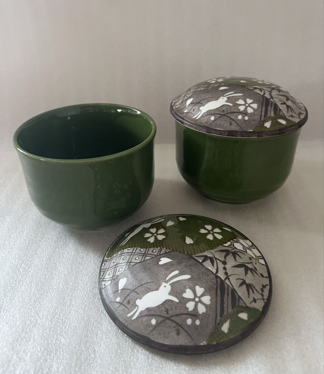 - 未使用 新品 美濃焼 仁峰窯 蓋付き 碗 2個 セット ペア 織部 花兎 花うさぎ セット 茶碗蒸し 織部焼 織部釉 グリーン