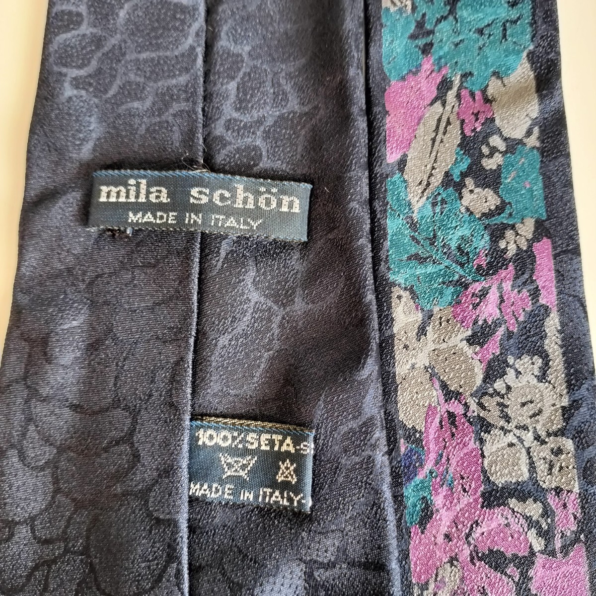 - ミラショーン(Mila Schoen)紫グレー青葉っぱ模様ロゴネクタイ