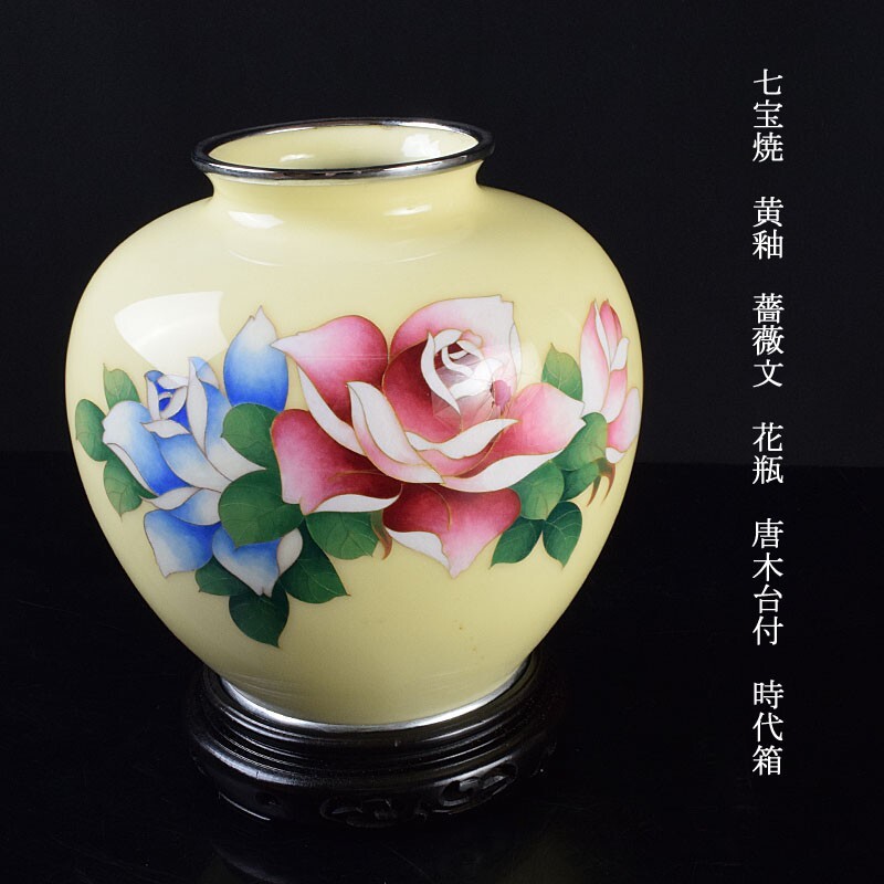 - 七宝焼 黄釉 薔薇文 花瓶 唐木台付 時代箱 VJMR