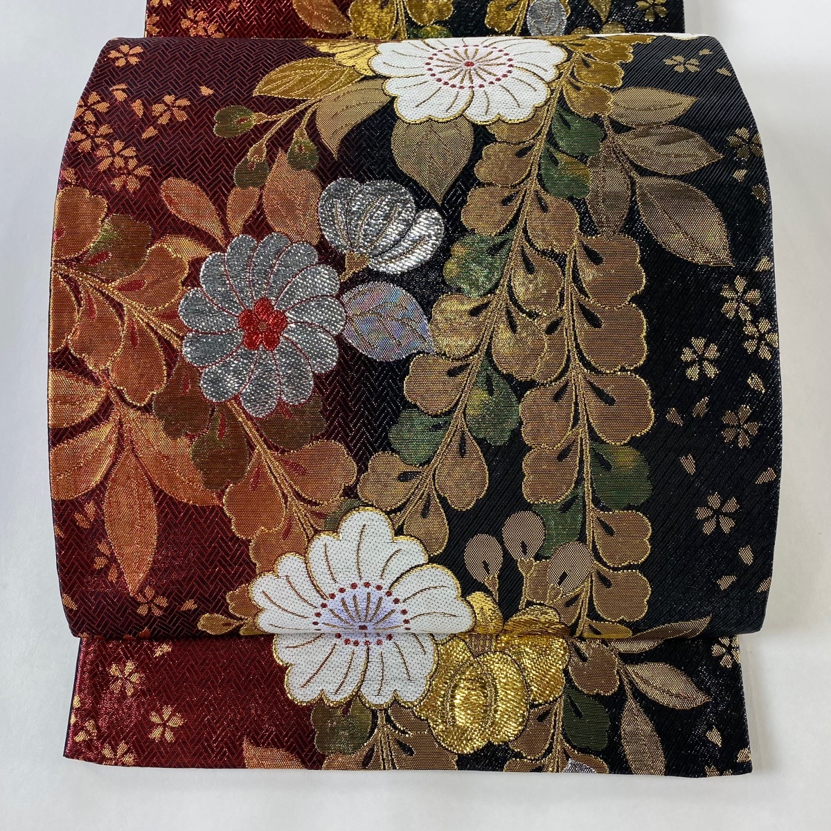 > 袋帯 美品 秀品 草花 桜 金糸 箔 赤黒 六通 正絹 【中古】