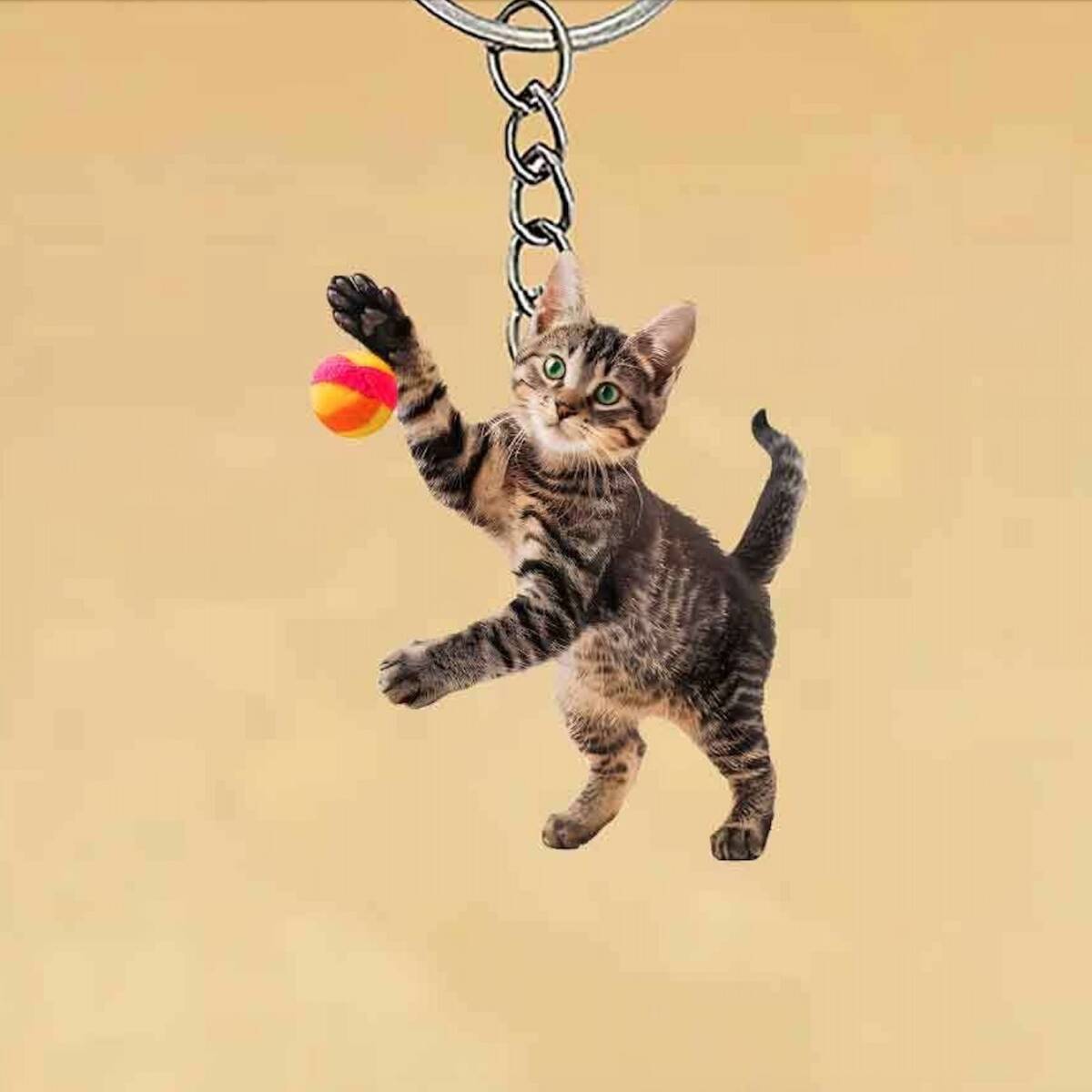 > キーホルダー 玉で遊ぶ猫 アクリル 平面 2D キジトラ 茶色 ねこ アクリル 5cm 吊り下げ かわいい ネコ 車 キーチェーン おしゃれ t7913