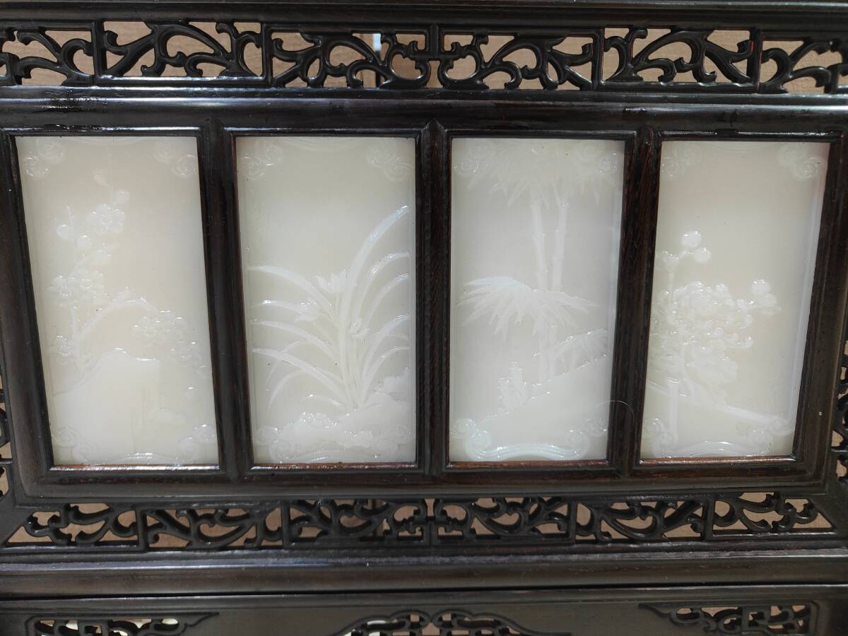 > 古木彫り 秘藏 清代 古烏木白玉花卉屏風【梅蘭竹菊図・四君子】 書道具 文房具 時代物 中国古美術 細密彫 置物 賞物 唐物 木彫り 文玩 8.14