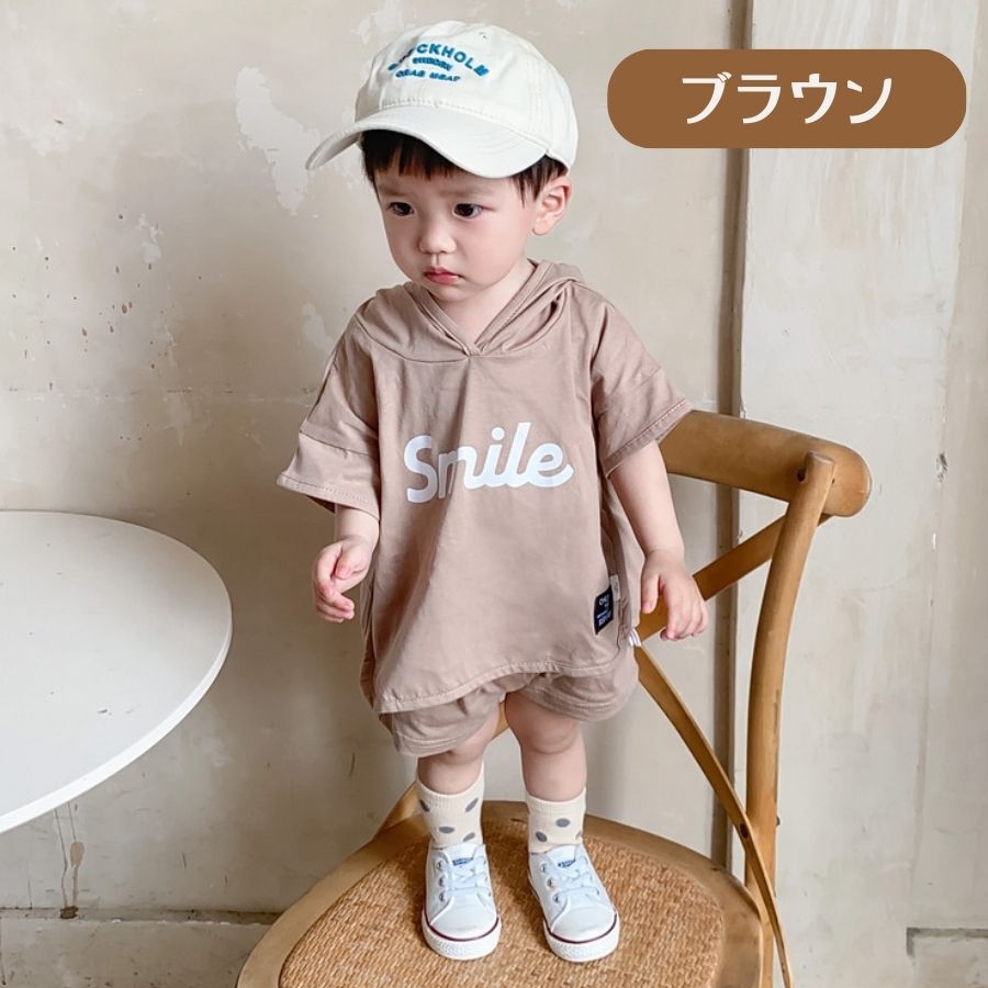 > ブラウン 66cm 2点セット フード付き薄手 スウェット風 上下セット 半袖 韓国風子供服 セットアップ 綿100% 男の子 キッズ 春夏