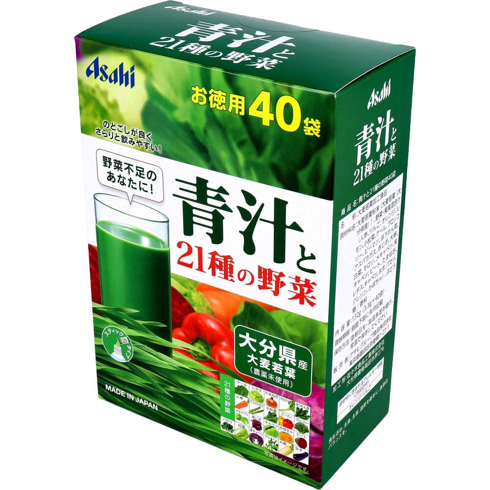 ▼▼▼▼▼▼注意事項▼▼▼▼▼▼・送料込み(送料700円が商品価格に含まれています) 一部地域では追加送料あり。・お取り寄せ商品です。弊社にて手配後、メーカー・卸業者からの直送になります。・まれにメーカー欠品、出荷遅延等が発生致します。問題発生時は別途メールにてご連絡致します。・配送方法の指定、日時指定、置き配、ギフト対応、他商品との同梱配送などは対応できません。・まとめ買いや複数購入の場合は通常より発送に時間が掛かる場合がございます・複数個口の場合、2階以上への搬入ができない場合があります。(その場合は1階での受け渡しとなります)・大型連休、お盆、年末年始などは発送をお休みさせていただく場合がございます・メーカー都合により、パッケージは予告なく変更される場合がございます・梱包用のダンボールはリサイクル品を使用させていただきます。・注文に関するご連絡(注文確定通知・発送通知など)はメールでご案内させていただきます※商品ページの内容について、少しでもご不明な点などがございましたら購入前に一度ご連絡ください▲▲▲▲▲▲注意事項▲▲▲▲▲▲〇商品説明のどごしが良く、さらりと飲みやすい!●契約農家でしっかり管理 大分県産大麦若葉。温暖な気候で、栽培に適した土壌を持つ大分県。しっかりした管理体制のもと、信頼のおける契約農家で大切に育てた大麦若葉を使用しています。●農薬・化学肥料を使わない有機栽培大麦若葉。毎日飲むから、素材にこだわりました。原料に使用している大麦若葉は、栽培期間中に農薬や化学肥料を一切使用しない有機栽培です。●味わい深く、のどごしの良いまるごと加工。畑で収穫した大麦若葉は、新鮮なうちに工場へ。のどごし良く飲めるために、独自の技術で乾燥・微粉砕。●フリーズドライだから風味豊か。アサヒグループの工場で、こだわりの大麦若葉を21種類の野菜汁をフリーズドライ加工。風味や栄養素が失われにくく、サラリと飲みやすい青汁です。※21種類の野菜は、カゴメ(株)の野菜・果実混合汁原料を使用しています。【名称】大麦若葉加工食品【原材料名】大麦若葉粉末(大麦若葉(大分県産))、野菜・果実混合汁(人参、りんご、オレンジ、レモン、小松菜、ケール、ブロッコリー、ビーマン、ほうれん草、アスパラガス、赤じそ、大根、白菜、セロリ、メキャベツ、紫キャベツ、ビート、たまねぎ、レタス、キャベツ、なす、パセリ、クレソン、かぼちゃ)、ぶどう糖/香料【栄養成分表示 1袋(3.3g)当たり】エネルギー・・・6〜15kcaLたんぱく質・・・0.4〜1g脂質・・・0.04〜0.3g炭水化物・・・1.5〜2.9g -糖質・・・0.7〜1.2g -食物繊維・・・0.8〜1.7g食塩相当量・・・0.001〜0.02gビタミンA・・・1〜60μgビタミンB1・・・0.007〜0.03mgビタミンB2・・・0.01〜0.06mgビタミンC・・・0.03〜2.4mgビタミンE・・・0.03〜0.4mgビタミンK・・・20〜120μg葉酸・・・3〜30μgカルシウム・・・5〜20mgマグネシウム・・・1〜8mg鉄・・・0.04〜0.7mgカリウム・・・30〜150mg【アレルギー物質(28品目中)】オレンジ、りんご【お召し上がり方】・1日1〜2袋を目安にお召し上がりください。・100mL程度のお水、お湯、牛乳などに混ぜてお召し上がりください。お好みによって量は調整してください。・沈殿しますので、よくかき混ぜてお早めにお飲みください。・豆乳やヨーグルト、りんごジュースに混ぜてもおいしい!【保存方法】直射日光・高温多湿を避け、常温で保存してください。【使用上の注意】・1日の摂取目安量を守ってください。・薬(特に血液凝固阻止薬など)を服用の方、ビタミンKの摂取制限を受けている方、通院中の方は医師にご相談ください。・食物アレルギーの認められる方は、パッケージの原材料表記をご確認の上ご使用ください。・体質や体調により、身体に合わない場合があります。その場合は使用を中止してください。・小児の手の届かないところに置いてください。・大麦若葉は、収穫時期によっては色調や風味などが異なる場合がありますが、品質上問題ありません。・個包装開封後はお早めにお召し上がりください。・あたたかいお飲み物で召し上がる際は、シェイカーの使用は危険ですのでおやめください。・万一品質に不都合がありましたらお取り替えいたします。〇商品仕様個装サイズ:130X190X70mm個装重量:約220g内容量:132g(3.3g×40袋)製造国:日本【発売元:アサヒグループ食品株式会社】(出典:アサヒグループ食品)