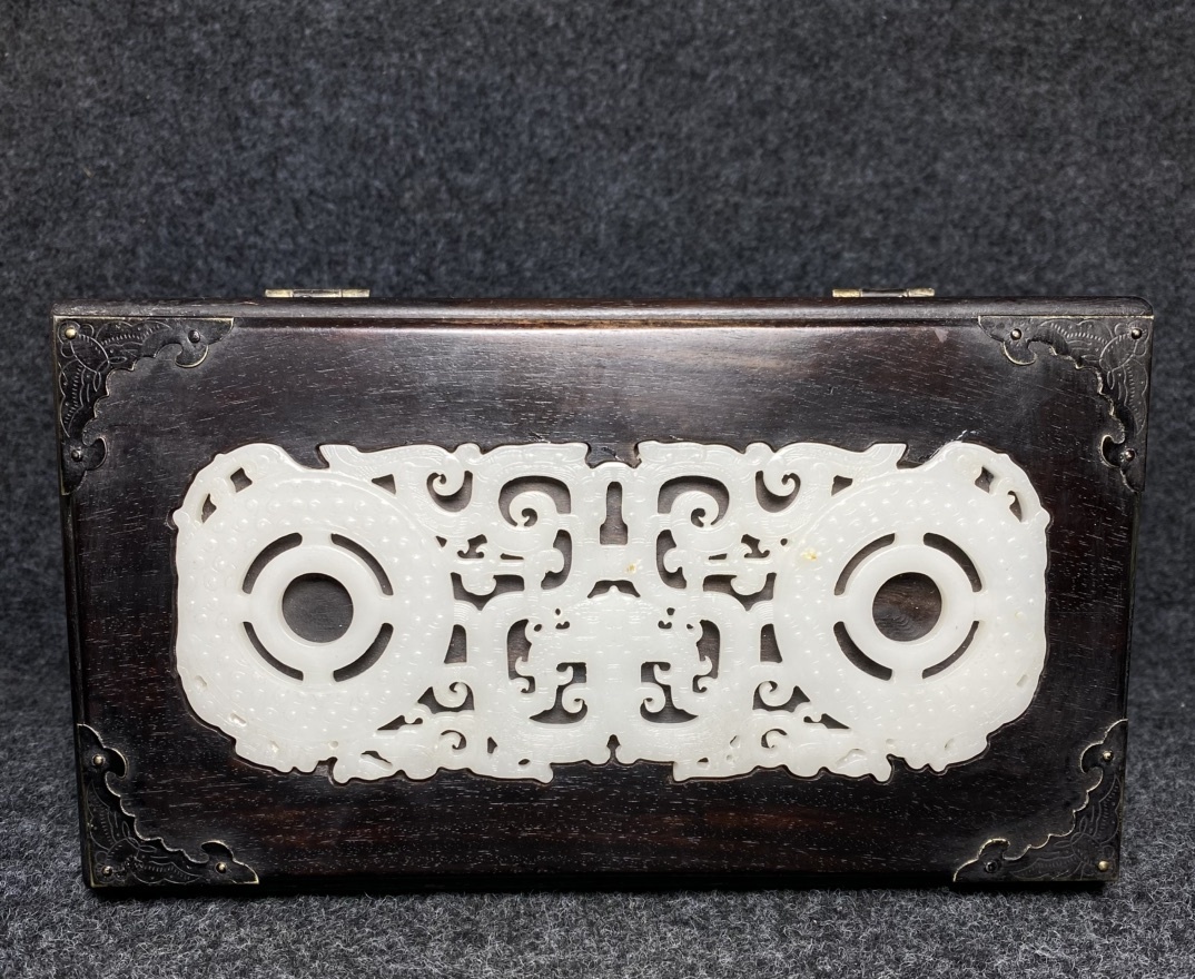 - 秘藏 清代 白玉 をちりばめた黒檀のアクセサリーボックス 書道具 文房具 時代物 中国古美術 細密彫 置物 賞物 唐物 文玩 816