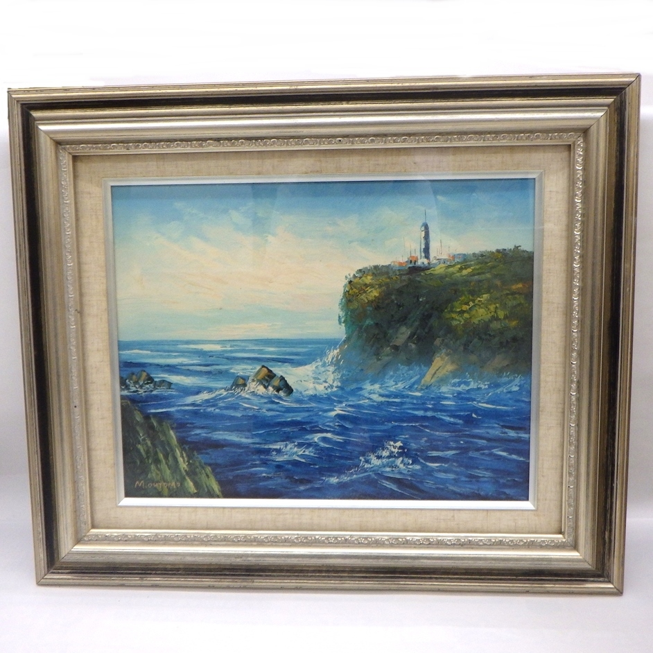 > SI-90 M.OHTOMO 絵画 油絵 油彩 灯台 岬 額装 58.5×49.5cm サインあり 作者不明 アンティークショップ保管品