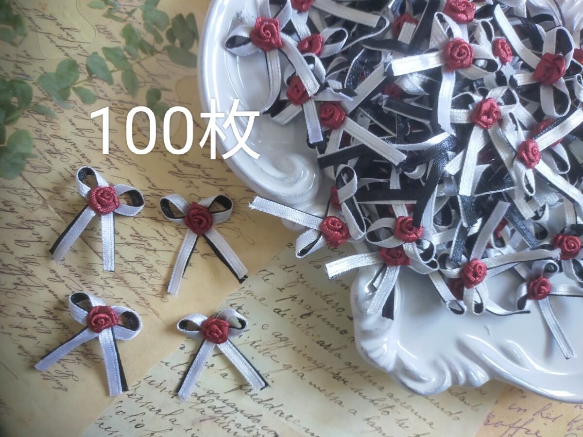 - A67 残り僅か◆【100枚】まとめ【横2.8*縦3.3cm】幅3mm蝶々結び巻き薔薇付きデコリボンモチーフブラック黒白レッド