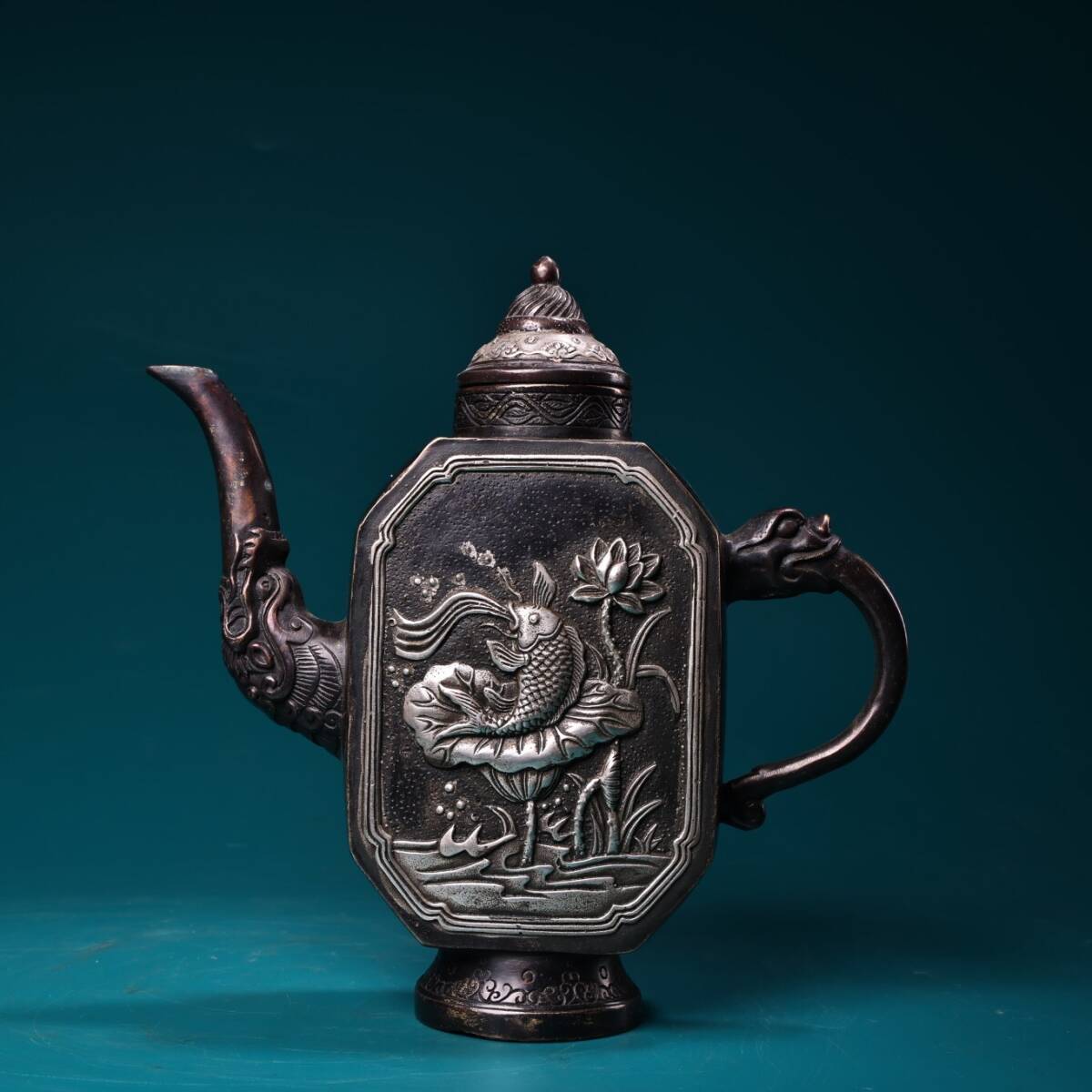 - 『館蔵珍品 銅製 銀鍍 年年有餘紋 酒壺 置物 賞物』稀少珍蔵品 古賞物 貴重物品 収蔵品 中国古美術 時代物 古董品