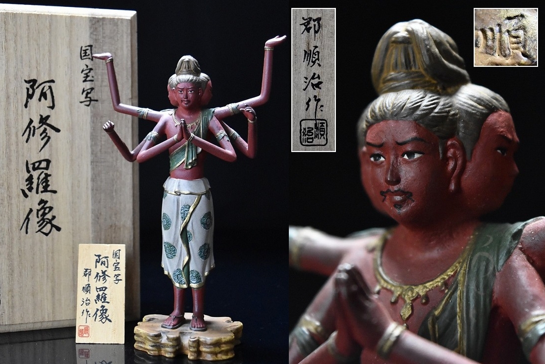 - 彫刻家【郡 順治】ブロンズ 色絵銅 彩色 国宝写『阿修羅像』置物 共箱 立札付