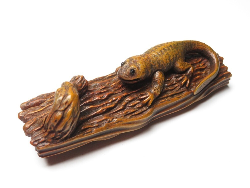 - 【11410】明治期 堤物 木製 古木にトカゲ 根付(初品・買取品)