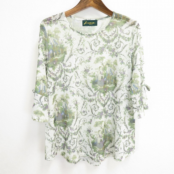 > #a バラ色の暮し カットソー 七分袖 M オフホワイト 緑 マルチ パワーネット シースルー 総柄 オリジナルプリント リボン 美品 939011 k01