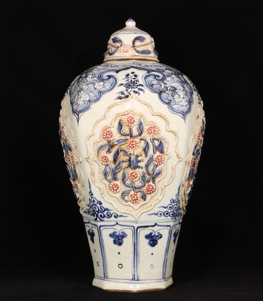 > 元時代 唐物 青白釉に赤 捏花梅瓶 陶磁器 中国美術 古美術 置物 高さ52 cm 直径28 cm 819