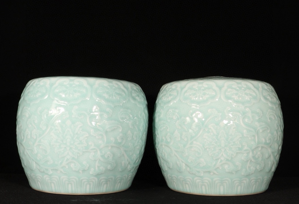 - 中国清代 乾隆年製 粉青釉 刻絡枝蓮紋 鼓腰掛け 時代物 陶磁器 中国美術 高さ22 cm 直径21.5 cm 骨董品 唐物 820