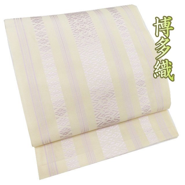 - 夏物 夏帯 名古屋帯 なごや帯 中古 リサイクル 正絹 カジュアル 全通 博多織 縦段模様 献上柄 鳥の子色 白藤色 きもの北條 A1259-13