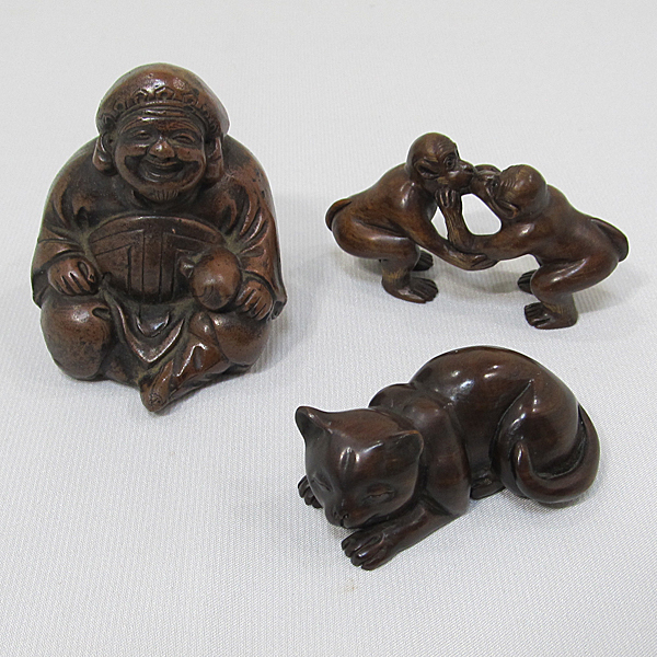 - 在銘 木彫根付など 3点まとめて /陶製 大黒天 木彫根付 猿 猫