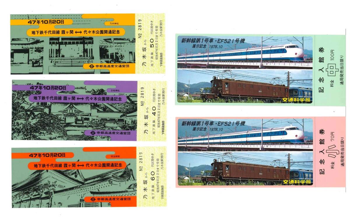 - 記念乗車券 帝都高速度交通営団 千代田線霞ヶ関 代々木公園開通 交通科学館「新幹線第1号車 EF521号機」展示記念 記念入館券 昭和 k39