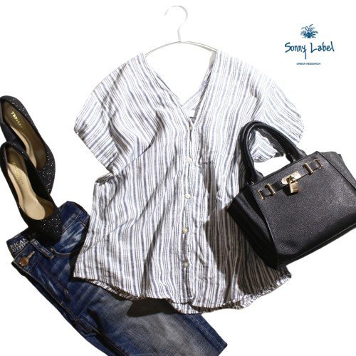 - 美品 サニーレーベル Sonny Label URBAN RESEARCH アーバンリサーチ 夏 ストライプ 柄 ナチュラル コットン 半袖 シャツ ブラウス 紺 白