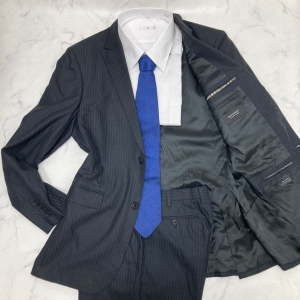 > 【M】バーバリーブラックレーベル super100' セットアップスーツ ストライプ 総裏 サイドベンツ 仮切羽 2B ウール 通年 濃紺系 B1333