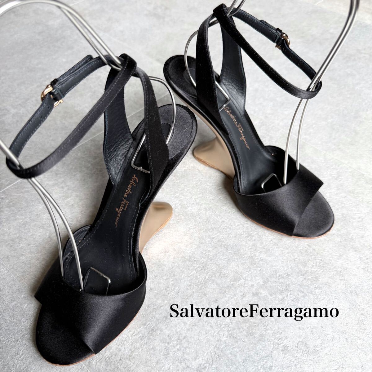 > 美品 SalvatoreFerragamo サルヴァトーレフェラガモ ストラップサンダル サテン 黒 6C 23.5cm 変形ヒール