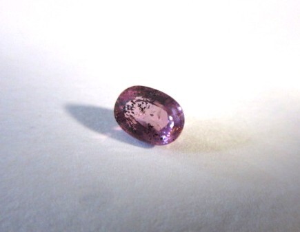 落ち着いた紫ピンクのサファイアです。黒い点々としたインクルージョンがありますが、透明感とテリがあります。UVライトで少し赤く蛍光します。非加熱。