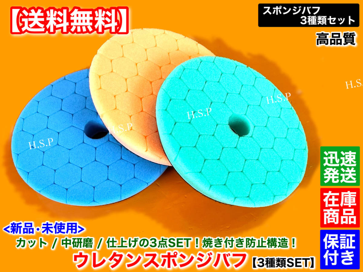 - 保証【送料無料】新品 スポンジバフ 3種SET パッド径 125mm 焼付防止 外径150mm 粗磨き 中研磨 仕上げ 傷消し オーロラ コンパウンド 磨き
